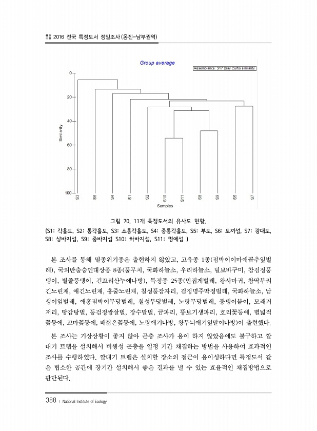 2016 전국 특정도서 정밀조사 옹진-남부권역 388 ? National Institute of Ecology 그림 70. 11개 특정도서의 유사도 현황. S1각흘도, S2통각흘도, S3소통각흘도, S4중통각흘도, S5부도, S6토끼섬, S7광대도, S8상바지섬, S9중바지섬 S10하바지섬, S11멍에섬 본 조사를 통해 멸종위기종은 출현하지 않았고, 고유종 1종 점박이이마애꼽추잎벌 레 , 국외반출승인대상종 8종 풀무치, 국화하늘소, 우리하늘소, 털보바구미, 참검정풍 뎅이, 별줄풍뎅이, 긴꼬리산누에나방 , 특정종 25종 민집게벌레, 왕사마귀, 참딱부리 긴노린재, 애긴노린재, 홍줄노린재, 칠성풀잠자리, 검정명주딱정벌레, 국화하늘소, 남 생이잎벌레, 애홍점박이무당벌레, 칠성무당벌레, 노랑무당벌레, 풍뎅이붙이, 모...