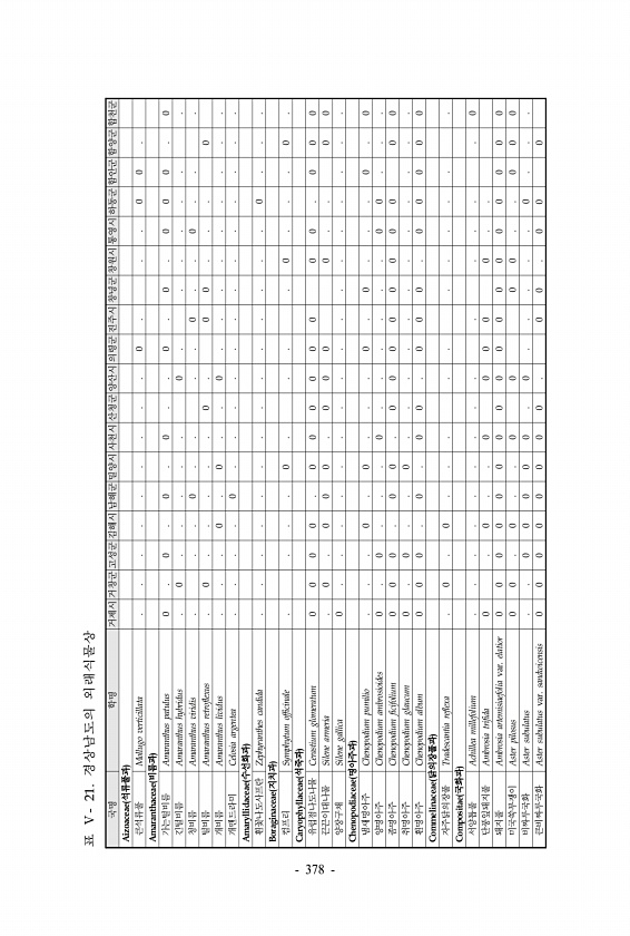 국명 학명 거제시 거창군 고성군 김해시 남해군 밀양시 사천시 산청군 양산시 의령군 진주시 창녕군 창원시 통영시 하동군 함안군 함양군 합천군 Aizoaceae 석류풀과 큰석류풀 Mollugo verticillata 0 0 0 Amaranthaceae 비름과 가는털비름 Amaranthus patulus 0 0 0 0 0 0 0 0 0 0 긴털비름 Amaranthus hybridus 0 0 청비름 Amaranthus viridis 0 0 0 털비름 Amaranthus retroflexus 0 0 0 0 0 개비름 Amaranthus lividus 0 0 0 개맨드라미 Celosia argentea 0 Amaryllidaceae 수선화과 흰꽃나도사프란 Zephyranthes candida 0 Boraginaceae...