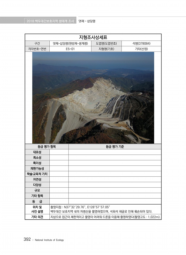 2018 백두대간보호지역 생태계 조사 댓재 삽당령 392 ? National Institute of Ecology 지형조사상세표 구간 댓재삽당령 원방재생계령 도엽명 도엽번호 석병 378084 격자번호-연번 E5-01 지형명 기호 기타 산정 등급 평가 항목 등급 평가 기준 대표성 희소성 특이성 재현가능성 학술?교육적 가치 자연성 다양성 규모 기타 항목 등 급 위치 및 사진 설명 촬영지점 N37°32′29.76″, E128°57′57.05″ 백두대간 보호지역 내의 자병산을 촬영하였으며, 석회석 채굴로 인해 훼손되어 있다. 기타 의견 지상으로 접근이 제한적이고 촬영이 어려워 드론을 이용해 촬영하였다 촬영고도 1,022m