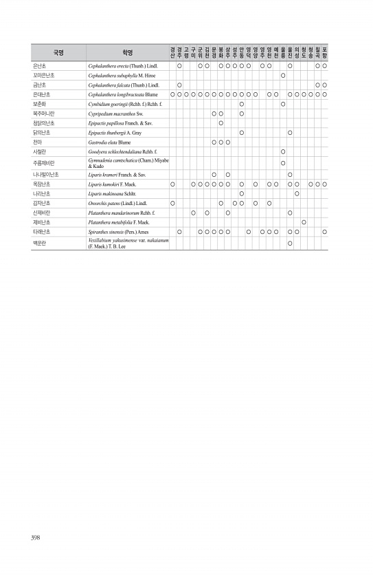 398 은난초 Cephalanthera erecta Thunb. Lindl. ○ ○ ○ ○ ○ ○ ○ ○ ○ ○ ○ ○ ○ 꼬마은난초 Cephalanthera subaphylla M. Hiroe ○ 금난초 Cephalanthera falcata Thunb. Lindl. ○ ○ ○ 은대난초 Cephalanthera longibracteata Blume ○ ○ ○ ○ ○ ○ ○ ○ ○ ○ ○ ○ ○ ○ ○ ○ ○ ○ ○ ○ ○ 보춘화 Cymbidium goeringii Rchb. f. Rchb. f. ○ ○ 복주머니란 Cypripedium macranthos Sw. ○ ○ ○ 청닭의난초 Epipactis papillosa Franch. & Sav. ○ 닭의난초 Epipactis thunbergii A. Gray...
