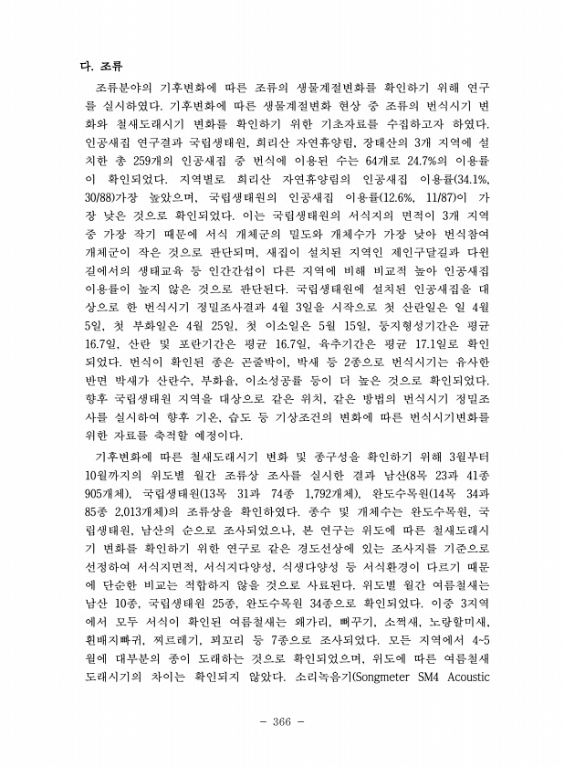 366 다. 조류 조류분야의 기후변화에 따른 조류의 생물계절변화를 확인하기 위해 연구 를 실시하였다. 기후변화에 따른 생물계절변화 현상 중 조류의 번식시기 변 화와 철새도래시기 변화를 확인하기 위한 기초자료를 수집하고자 하였다. 인공새집 연구결과 국립생태원, 희리산 자연휴양림, 장태산의 3개 지역에 설 치한 총 259개의 인공새집 중 번식에 이용된 수는 64개로 24.7%의 이용률 이 확인되었다. 지역별로 희리산 자연휴양림의 인공새집 이용률 34.1%, 30/88 가장 높았으며, 국립생태원의 인공새집 이용률 12.6%, 11/87 이 가 장 낮은 것으로 확인되었다. 이는 국립생태원의 서식지의 면적이 3개 지역 중 가장 작기 때문에 서식 개체군의 밀도와 개체수가 가장 낮아 번식참여 개체군이 작은 것으로 판단되...