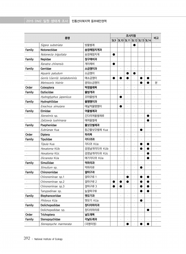 2015 DMZ 일원 생태계 조사 민통선이북지역 동부해안권역 392 ? National Institute of Ecology 종명 조사지점 비고 St.9 St.10 St.11 St.12 St.13 St.14 Sigara substriata 방물벌레 ● Family Notonectidae 송장헤엄치게과 Notonecta triguttata 송장헤엄치게 ● Family Nepidae 장구애비과 Ranatra chinensis 게아제비 ● Family Gerridae 소금쟁이과 Aquaris paludum 소금쟁이 ● ● Gerris Gerris latiabdominis 애소금쟁이 ● ● ● ● ● Metrocoris histrio 광대소금쟁이 ...