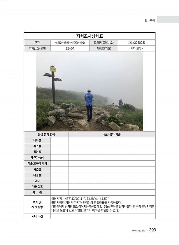 Ⅲ. 부록 www.nie.re.kr ? 393 지형조사상세표 구간 삽당령신배령 대관령매봉 도엽명 도엽번호 차항 378072 격자번호-연번 E3-04 지형명 기호 기타 안부 등급 평가 항목 등급 평가 기준 대표성 희소성 특이성 재현가능성 학술?교육적 가치 자연성 다양성 규모 기타 항목 등 급 위치 및 사진 설명 촬영지점 N37°43′09.41″, E128°44′44.52″ 촬영지점과 지형의 위치가 인접하여 동일좌표를 사용하였다. 대관령에서 선자령으로 이어지는등산로의 1,125m 안부를 촬영하였다. 안부의 일부지역은 나지로 노출돼 있고 다양한 크기의 핵석을 확인할 수 있다. 기타의견