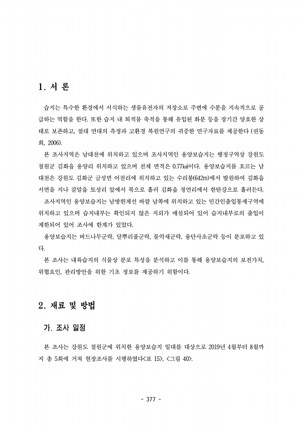 377 습지는 특수한 환경에서 서식하는 생물유전자의 저장소로 주변에 수분을 지속적으로 공 급하는 역할을 한다 또한 습지 내 퇴적물 축적을 통해 유입된 화분 등을 장기간 양호한 상 태로 보존하고 절대 연대의 측정과 고환경 복원연구의 귀중한 연구자료를 제공한다 권동 , 희, 2006 본 조사지역은 남대천에 위치하고 있으며 조사지역인 용양보습지는 행정구역상 강원도 철원군 김화읍 용양리 위치하고 있으며 전체 면적은 이다 용양보습지를 흐르는 남 0.77 .㎢ 대천은 강원도 김화군 금성면 어천리에 위치하고 있는 수리봉 에서 발원하여 김화읍 642m 서면을 지나 갈말읍 토성리 앞에서 북으로 흘러 김화읍 정연리에서 한탄강으로 흘러든다. 조사지역인 용양보습지는 남방한계선 바깥 남쪽에 위치하고 있는 민간인출입통제구역에 위치하...