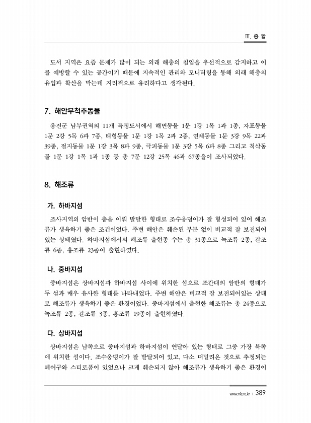 Ⅲ. 종 합 www.nie.re.kr ? 389 도서 지역은 요즘 문제가 많이 되는 외래 해충의 침입을 우선적으로 감지하고 이 를 예방할 수 있는 공간이기 때문에 지속적인 관리와 모니터링을 통해 외래 해충의 유입과 확산을 막는데 지리적으로 유리하다고 생각된다. 7. 해안무척추동물 옹진군 남부권역의 11개 특정도서에서 해면동물 1문 1강 1목 1과 1종, 자포동물 1문 2강 5목 6과 7종, 태형동물 1문 1강 1목 2과 2종, 연체동물 1문 3강 9목 22과 39종, 절지동물 1문 1강 3목 8과 9종, 극피동물 1문 3강 5목 6과 8종 그리고 척삭동 물 1문 1강 1목 1과 1종 등 총 7문 12강 25목 46과 67종을이 조사되었다. 8. 해조류 가. 하바지섬 조사지역의 암반이 층을 이뤄 발달한 형태로...