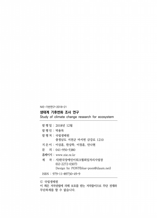 NIE-기반연구-2018-21 생태계 기후변화 조사 연구 Study of climate change research for ecosystem 발 행 일 2018년 12월 발 행 인 박용목 발 행 처 국립생태원 충청남도 서천군 마서면 금강로 1210 지 은 이 이상훈, 한상학, 이창훈, 안나현 문 의 041-950-5380 홈페이지 www.nie.re.kr 제 작 사 한국장애인이워크협회일자리사업장 02-2272-0307 Design by PONT blue-pont@daum.net ISBN 979-11-89730-49-9 ? 국립생태원 이 책은 저작권법에 의해 보호를 받는 저작물이므로 무단 전재와 무단복제를 할 수없습니다.