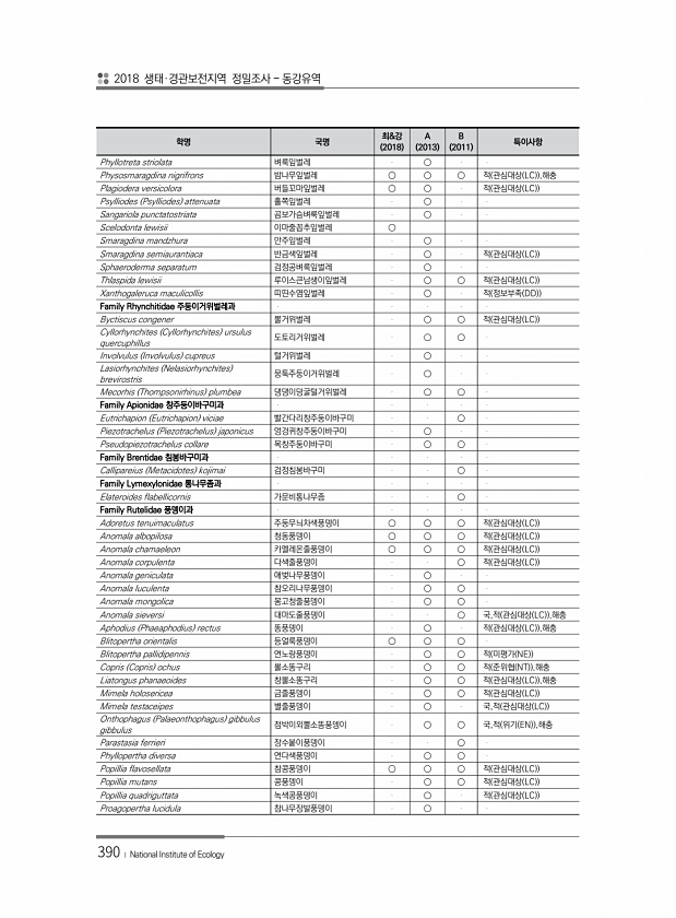 2018 생태·경관보전지역 정밀조사 동강유역 390 ? National Institute of Ecology 학명 국명 최&강 2018 A 2013 B 2011 특이사항 Phyllotreta striolata 벼룩잎벌레 ○ Physosmaragdina nigrifrons 밤나무잎벌레 ○ ○ ○ 적 관심대상 LC ,해충 Plagiodera versicolora 버들꼬마잎벌레 ○ ○ 적 관심대상 LC Psylliodes Psylliodes attenuata 홀쪽잎벌레 ○ Sangariola punctatostriata 곰보가슴벼룩잎벌레 ○ Scelodonta lewisii 이마줄꼽추잎벌레 ○ Smaragdina mandzhura 만주잎벌레 ○ Smaragdina s...