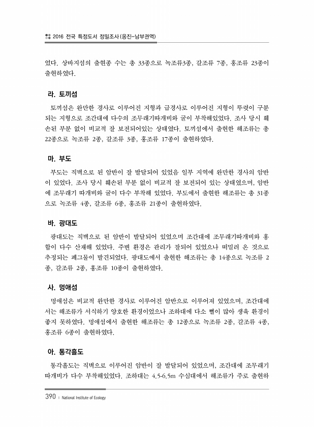 2016 전국 특정도서 정밀조사 옹진-남부권역 390 ? National Institute of Ecology 었다. 상바지섬의 출현종 수는 총 33종으로 녹조류3종, 갈조류 7종, 홍조류 23종이 출현하였다. 라. 토끼섬 토끼섬은 완만한 경사로 이루어진 지형과 급경사로 이루어진 지형이 뚜렷이 구분 되는 지형으로 조간대에 다수의 조무래기따개비와 굴이 부착해있었다. 조사 당시 훼 손된 부분 없이 비교적 잘 보전되어있는 상태였다. 토끼섬에서 출현한 해조류는 총 22종으로 녹조류 2종, 갈조류 3종, 홍조류 17종이 출현하였다. 마. 부도 부도는 직벽으로 된 암반이 잘 발달되어 있었음 일부 지역에 완만한 경사의 암반 이 있었다. 조사 당시 훼손된 부분 없이 비교적 잘 보전되어 있는 상태였으며, 암반 에 조무래기 ...