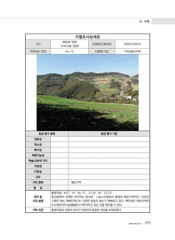 Ⅲ. 부록 www.nie.re.kr ? 393 지형조사상세표 구간 화방재댓재 구부시령댓재 도엽명 도엽번호 마차 379093 격자번호-연번 E4-13 지형명 기호 기타 훼손지역 등급 평가 항목 등급 평가 기준 대표성 희소성 특이성 재현가능성 학술?교육적 가치 자연성 다양성 규모 기타 항목 훼손지역 등 급 위치 및 사진 설명 촬영지점 N37°19′56.73″, E129°00′23.23″ 환선봉에서 큰재로 이어지는 등산로 1.8km지점에서 촬영한 훼손지역이다. 이곳은 고랭지 채소 재배지역으로 다양한 종류의 채소가 재배되고 있다. 백두대간 핵심지역와 조사경로까지 농업활동이 이루어지고 있는 것을 확인할 수 있다. 기타 의견 촬영지점과 지형의 위치가 인접하여 동일한 좌표를부여하였다.