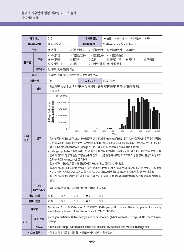 400 생태계 기후변화 영향·취약성·리스크 평가 -연구사례 분석- 사례 No. 318 사례 자료 유형 ■ 논문 □ 보고서 □ 기타 학술/기사자료 대상지 국가 United States 대상지 지역 North America, South America 부문 ■ 통합 □ 취약성평가 □ 영향성평가 □ 리스크평가 □ 모델링 분류군 부문 □ 육상식물 □ 식물 침엽수 □ 식물 활엽수 □ 식물 초 본 ■ 육상동물 □ 포유류 □ 조류 □ 곤충 류 ■ 양서류 □ 파충류 □ 수상동식물 □ 어류 □ 저서무척추류 ■ 기타 질병 세부정보 양서류의 항아리곰팡이병 목적 양서류의 항아리곰팡이병의 최근 발생 기원 연구 기후인자 T.M 자료기간 1964-2009 사례 개요 방법 황소개구리 bull frog 의 대량사육 및 전세계 수출과 항아리...