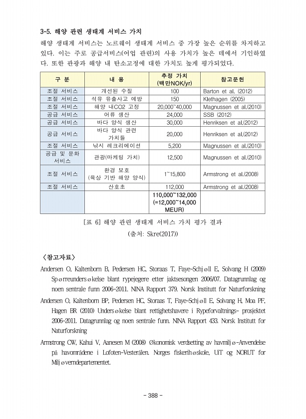 3-5. 해양 관련 생태계 서비스 가치 해양 생태계 서비스는 노르웨이 생태계 서비스 중 가장 높은 순위를 차지하고 있다. 이는 주로 공급서비스 어업 관련 의 사용 가치가 높은 데에서 기인하였 다. 또한 관광과 해양 내 탄소고정에 대한 가치도 높게 평가되었다. [표 6] 해양 관련 생태계 서비스 가치 평가 결과 출처Skre 2017 〈참고자료〉 Andersen O, Kaltenborn B, Pedersen HC, Storaas T, Faye-Schjøll E, Solvang H 2009 Spørreundersøkelse blant rypejegere etter jaktsesongen 2006/07. Datagrunnlag og noen sentrale funn 2006-2011. NINA Rapport 379...