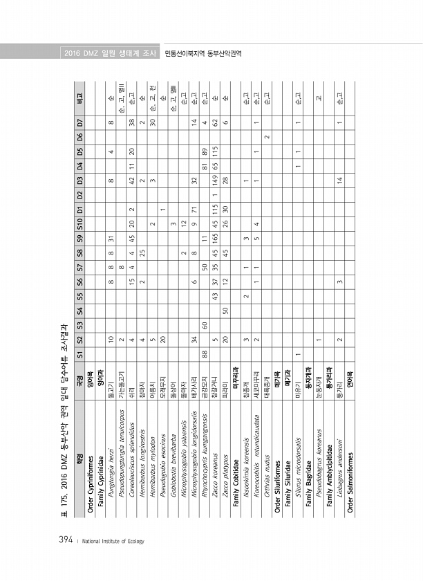 학명 국명 S1 S2 S3 S4 S5 S6 S7 S8 S9 S10 D1 D2 D3 D4 D5 D6 D7 비고 Order Cypriniformes 잉어목 Family Cyprinidae 잉어과 Pungtungia herzi 돌고기 10 8 8 8 31 8 4 8 순 Pseudopungtungia tenuicorpus 가는돌고기 2 8 순, 고, 멸II Coreoleuciscus splendidus 쉬리 4 15 4 4 45 20 2 42 11 20 38 순,고 Hemibarbus longirostris 참마자 4 2 25 2 2 순 Hemibarbus mylodon 어름치 5 2 3 30 순, 고, 천 Pseudogobio esocinus 모래무지 20 1 순 Gobiobotia brevibarba 돌상어 3...