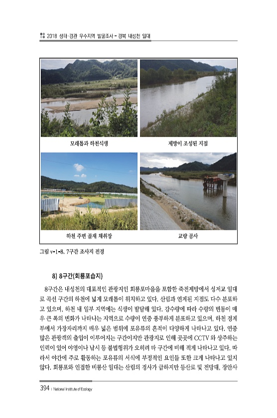 2018 생태·경관 우수지역 발굴조사 경북 내성천 일대 394 ? National Institute of Ecology 모래톱과 하천식생 제방이 조성된 지점 하천 주변 골재 채취장 교량 공사 그림 v-1-8. 7구간 조사지 전경 8 8 8구간은 내성천의 대표적인 관광지인 회룡포마을을 포함한 죽전제방에서 성저교 일대 로 곡선 구간의 하천에 넓게 모래톱이 위치하고 있다. 산림과 연계된 지점도 다수 분포하 고 있으며, 하천 내 일부 지역에는 식생이 발달해 있다. 강수량에 따라 수량의 변동이 매 우 큰 폭의 변화가 나타나는 지역으로 수량이 연중 풍부하게 분포하고 있으며, 하천 경계 부에서 가장자리까지 매우 넓은 범위에 포유류의 흔적이 다양하게 나타나고 있다. 연중 많은 관광객의 출입이 이루어지는 구간이지만 관광지로...