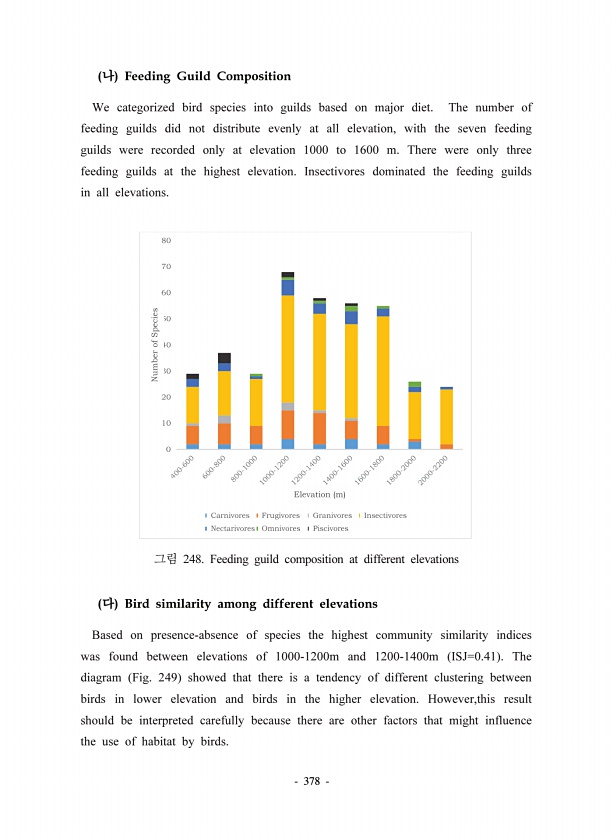 378 Feeding Guild Composition We categorized bird species into guilds based on major diet. The number of feeding guilds did not distribute evenly at all elevation, with the seven feeding guilds were recorded only at elevation 1000 to 1600 m. There were only three feeding guilds at the highest elevation. Insectivores dominated the feeding guilds in all elevations. 248. Feeding guild composition at ...