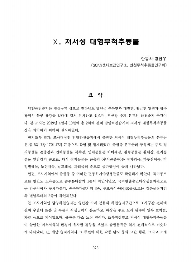 393 Ⅹ. 저서성 대형무척추동물 안동하·강현우 SOKN생태보전연구소, 인천무척추동물연구회 요 약 담양하천습지는 행정구역 상으로 전라남도 담양군 수북면과 대전면, 황금면 일원과 광주 광역시 북구 용강동 일대에 걸쳐 위치하고 있으며, 영산강 수계 본류의 하천습지 구간이 다. 본 조사는 2019년 4월과 10월에 총 2회에 걸쳐 담양하천습지의 저서성 대형무척추동물 상을 파악하기 위하여 실시하였다. 현지조사 결과, 조사대상인 담양하천습지에서 출현한 저서성 대형무척추동물의 분류군 은 총 5문 7강 17목 47과 79종으로 확인 및 집계되었다. 출현종 분류군의 구성비는 주로 절 지동물문 곤충강과 연체동물문 복족강, 연체동물문 이매패강, 환형동물문 환대강, 절지동 물문 연갑강의 순으로, 다시 절지동물문 곤충강 수서곤충...