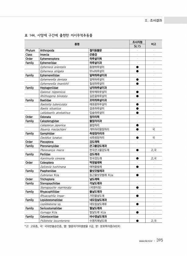 Ⅱ. 조사결과 www.nie.re.kr ? 395 종명 조사지점 비고 St.15 Phylum Arthropoda 절지동물문 Class Insecta 곤충강 Order Ephemeroptera 하루살이목 Family Ephemeridae 하루살이과 Ephemera orientalis 동양하루살이 ● Ephemera strigata 무늬하루살이 ● Family Ephemerellidae 알락하루살이과 Ephemerella dentata 알락하루살이 ● Ephemerella imanishii 칠성하루살이 ● Family Heptageniidae 납작하루살이과 Epeorus nipponicus 흰부채하루살이 ● Rhithrogena binotata 깊은골하루살이 ● Famil...