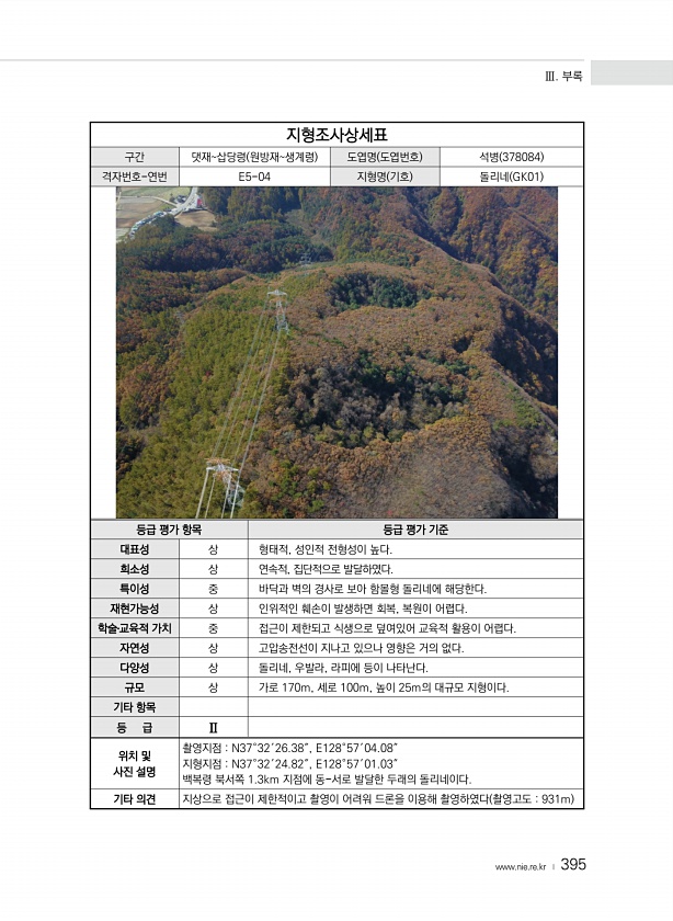 Ⅲ. 부록 www.nie.re.kr ? 395 지형조사상세표 구간 댓재삽당령 원방재생계령 도엽명 도엽번호 석병 378084 격자번호-연번 E5-04 지형명 기호 돌리네 GK01 등급 평가 항목 등급 평가 기준 대표성 상 형태적, 성인적 전형성이 높다. 희소성 상 연속적, 집단적으로 발달하였다. 특이성 중 바닥과 벽의 경사로 보아 함몰형 돌리네에 해당한다. 재현가능성 상 인위적인 훼손이 발생하면 회복, 복원이 어렵다. 학술?교육적 가치 중 접근이 제한되고 식생으로 덮여있어 교육적 활용이 어렵다. 자연성 상 고압송전선이 지나고 있으나 영향은 거의 없다. 다양성 상 돌리네, 우발라, 라피에 등이 나타난다. 규모 상 가로 170m, 세로 100m, 높이 25m의 대규모 지형이다. 기타 항목 등 급 Ⅱ 위치 및 사진...