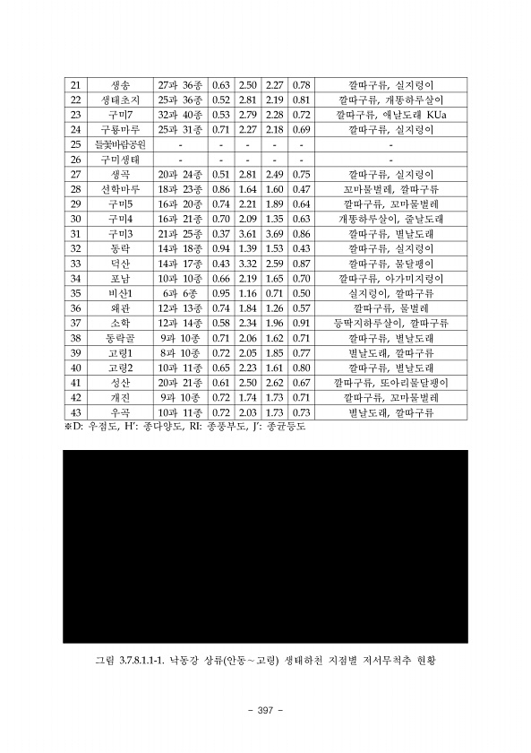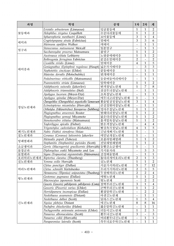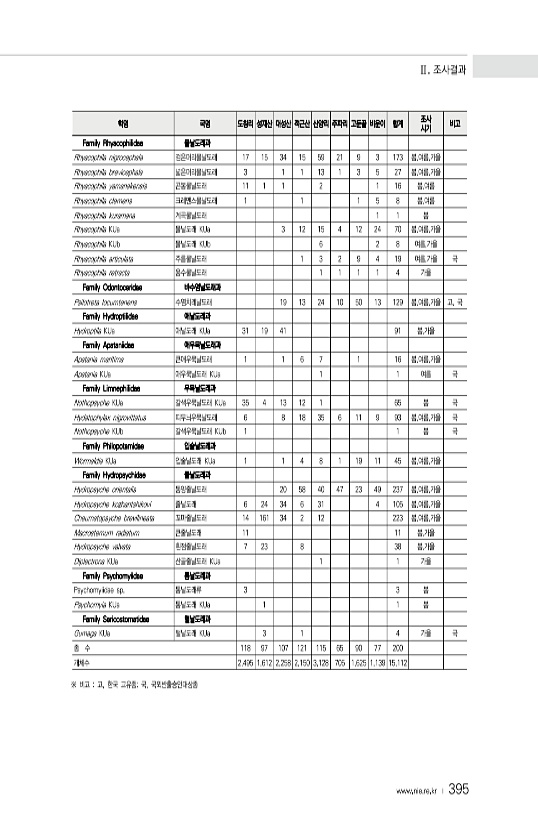 Ⅱ. 조사결과 www.nie.re.kr ? 395 학명 국명 도창리 성재산 대성산 적근산 산양리 주파리 고둔골 비운이 합계 조사 시기 비고 Family Rhyacophilidae 물날도래과 Rhyacophila nigrocephala 검은머리물날도래 17 15 34 15 59 21 9 3 173 봄,여름,가을 Rhyacophila brevicephala 넓은머리물날도래 3 1 1 13 1 3 5 27 봄,여름,가을 Rhyacophila yamanakensis 곤봉물날도래 11 1 1 2 1 16 봄,여름 Rhyacophila clemens 크레멘스물날도래 1 1 1 5 8 봄,여름 Rhyacophila kuramana 계곡물날도래 1 1 봄 Rhyacophila KUa 물날도래 KUa 3 12 15 4 12...