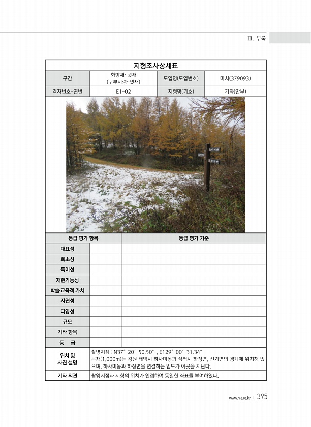 Ⅲ. 부록 www.nie.re.kr ? 395 지형조사상세표 구간 화방재댓재 구부시령댓재 도엽명 도엽번호 마차 379093 격자번호-연번 E1-02 지형명 기호 기타 안부 등급 평가 항목 등급 평가 기준 대표성 희소성 특이성 재현가능성 학술?교육적 가치 자연성 다양성 규모 기타 항목 등 급 위치 및 사진 설명 촬영지점 N37°20′50.50″, E129°00′31.34″ 큰재 1,000m 는 강원 태백시 하사미동과 삼척시 하장면, 신기면의 경계에 위치해 있 으며, 하사미동과 하장면을 연결하는 임도가 이곳을 지난다. 기타 의견 촬영지점과 지형의 위치가 인접하여 동일한 좌표를부여하였다.