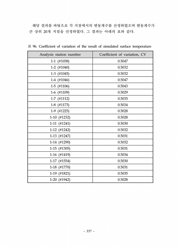 357 해당 결과를 바탕으로 각 지점에서의 변동계수를 산정하였으며 변동계수가 큰 상위 20개 지점을 선정하였다. 그 결과는 아래의 표와 같다. Analysis station number Coefficient of variation, CV 1-1 #1038 0.5047 1-2 #1040 0.5032 1-3 #1045 0.5032 1-4 #1046 0.5047 1-5 #1106 0.5043 1-6 #1109 0.5029 1-7 #1112 0.5035 1-8 #1173 0.5034 1-9 #1225 0.5028 1-10 #1232 0.5028 1-11 #1241 0.5030 1-12 #1242 0.5032 1-13 #1247 0.5031 1-14 #1290 0.5032 1-15 #1305 0.5031 1-16 #...