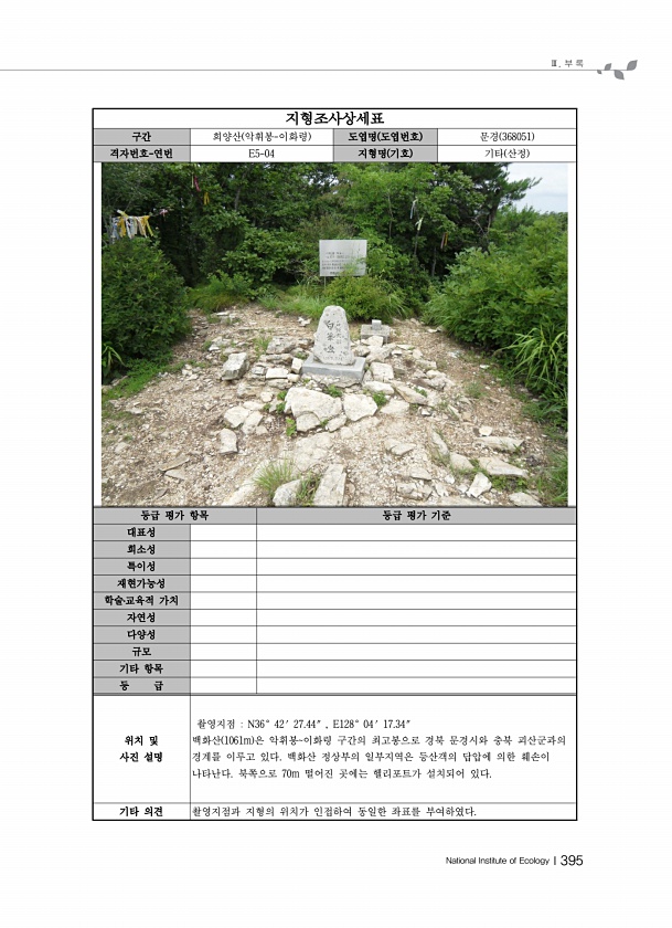 Ⅲ. 부 록 National Institute of EcologyⅠ395 지형조사상세표 구간 희양산 악휘봉-이화령 도엽명 도엽번호 문경 368051 격자번호-연번 E5-04 지형명 기호 기타 산정 등급 평가 항목 등급 평가 기준 대표성 희소성 특이성 재현가능성 학술?교육적 가치 자연성 다양성 규모 기타 항목 등 급 위치 및 사진 설명 촬영지점 N36° 42′ 27.44″ , E128° 04′ 17.34″ 백화산 1061m 은 악휘봉이화령 구간의 최고봉으로 경북 문경시와 충북 괴산군과의 경계를 이루고 있다. 백화산 정상부의 일부지역은 등산객의 답압에 의한 훼손이 나타난다. 북쪽으로 70m 떨어진 곳에는 헬리포트가 설치되어 있다. 기타 의견 촬영지점과 지형의 위치가 인접하여 동일한 좌표를부여하였다.