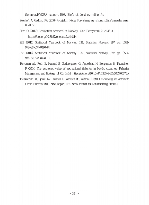 flommer.HYDRA rapport R03. Bioforsk Jord og miljø,?s Skonhoft A, Gudding PA 2010 Rypejakt i Norge Forvaltning og økonomi.Samfunnsøkonomen 841?.53. Skre O 2017 Ecosystem services in Norway. One Ecosystem 2e14814. https//doi.org/10.3897/oneeco.2.e14814 SSB 2012 Statistical Yearbook of Norway. 131. Statistics Norway, 397 pp. [ISBN 978-82-537-8490-8] SSB 2013 Statistical Yearbook of Norway. 132. Stati...