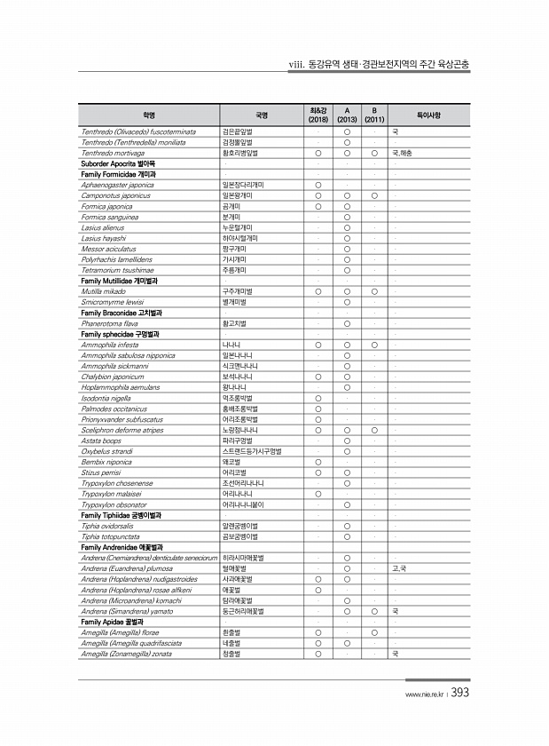 viii. 동강유역 생태·경관보전지역의 주간 육상곤충 www.nie.re.kr ?393 학명 국명 최&강 2018 A 2013 B 2011 특이사항 Tenthredo Olivacedo fuscoterminata 검은끝잎벌 ○ 국 Tenthredo Tenthredella moniliata 검정뿔잎벌 ○ Tenthredo mortivaga 황호리병잎벌 ○ ○ ○ 국,해충 Suborder Apocrita 벌아목 Family Formicidae 개미과 Aphaenogaster japonica 일본장다리개미 ○ Camponotus japonicus 일본왕개미 ○ ○ ○ Formica japonica 곰개미 ○ ○ Formica sanguinea 분개미 ○ Lasius...