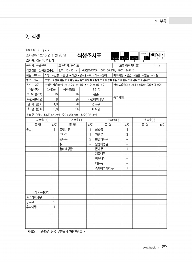 Ⅴ. 부록 www.nie.re.kr ? 397 2. 식생 No 01-01 농가도 조사일자 2015 년 8 월 20 일 조사자이남주, 김갑식 식생조사표 군락명곰솔군락 조사지역농가도 도엽명 격자번호 식생상관상록침엽수림 면적15×15 ㎡ 위?경도 GPS 34°509N, 128° 931E 해발40 m 지형□산정 □능선 ■사면 ■상□중□하 □계곡□평지 미세지형■평면 □돌출 □함몰 □요철 방위NW 토양■갈색삼림토□적황색삼림토□암적색삼림토□회갈색삼림토□침식토□미숙토□암쇄토 경사30° 낙엽부식층 cm □.≥20 □ 15 ■ 10 □ 5 □0 암석노출 % □≥51□ 50□ 25■ 5□0 계층구분 높이 m 식피율 % 우점종 특기사항교 목 층 T1 15 70 곰솔 아교목층 T2 8 90 사스레피나무 관 목 층 S 1.0 20 ...