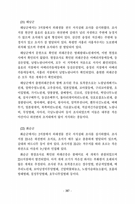 387 21 해남군 해남군에서는 3지점에서 외래생물 전국 서식실태 조사를 실시하였다. 조사 지점 현산면 읍호리 읍호교는 하천변에 갈대가 널리 자생하고 주변에 농경지 가 많으며 초지대가 넓게 형성되어 있다. 삼산면 송정리 저산제는 주변에 농 경지가 있고 초지가 잘 발달되어 있다. 북평면 서홍리 서홍저수지는 도로변에 위치해 있으며 주변에 초지대가 잘 발달되어 있다. 해남군에서 문헌으로 확인된 외래곤충은 방패광대노린재이며, 이번 현장조 사에서 확인되지 않았다. 현장조사로 확인된 외래곤충은 아메리카동애등에, 등 검은말벌, 남방노랑나비이며, 모두 이 지역에서 처음으로 서식이 화인되었다. 읍호리 지점에서 아메리카동애등에와 등검은말벌이, 송정리 지점에서 아메리 카동애등에가, 서홍리 지점에서 남방노랑나비가 확인되었다. 출...