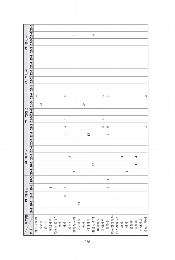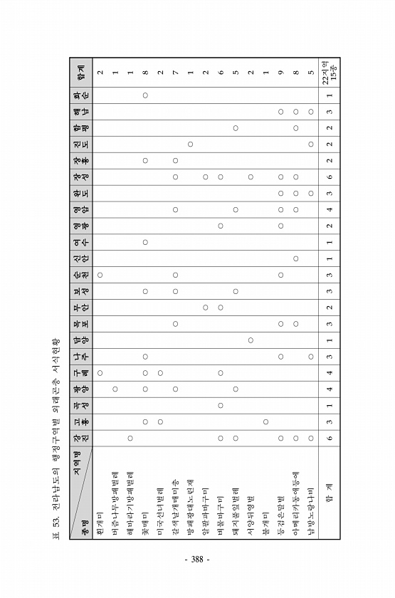 표 53. 전라남도의 행정구역별 외래곤충 서식현황 지역명 종명 강진 고흥 곡성 광양 구례 나주 담양 목포 무안 보성 순천 신안 여수 영광 영암 완도 장성 장흥 진도 함평 해남 화순 합계 흰개미 ○ ○ 2 버즘나무방패벌레 ○ 1 해바라기방패벌레 ○ 1 꽃매미 ○ ○ ○ ○ ○ ○ ○ ○ 8 미국선녀벌레 ○ ○ 2 갈색날개매미충 ○ ○ ○ ○ ○ ○ ○ 7 방패광대노린재 ○ 1 알팔파바구미 ○ ○ 2 벼물바구미 ○ ○ ○ ○ ○ ○ 6 돼지풀잎벌레 ○ ○ ○ ○ ○ 5 서양뒤영벌 ○ ○ 2 불개미 ○ 1 등검은말벌 ○ ○ ○ ○ ○ ○ ○ ○ ○ 9 아메리카동애등에 ○ ○ ○ ○ ○ ○ ○ ○ 8 남방노랑나비 ○ ○ ○ ○ ○ 5 합 계 6 3 1 4 4 3 1 3 2 3 3 1 1 2 4 3 6 2 2 2 3...