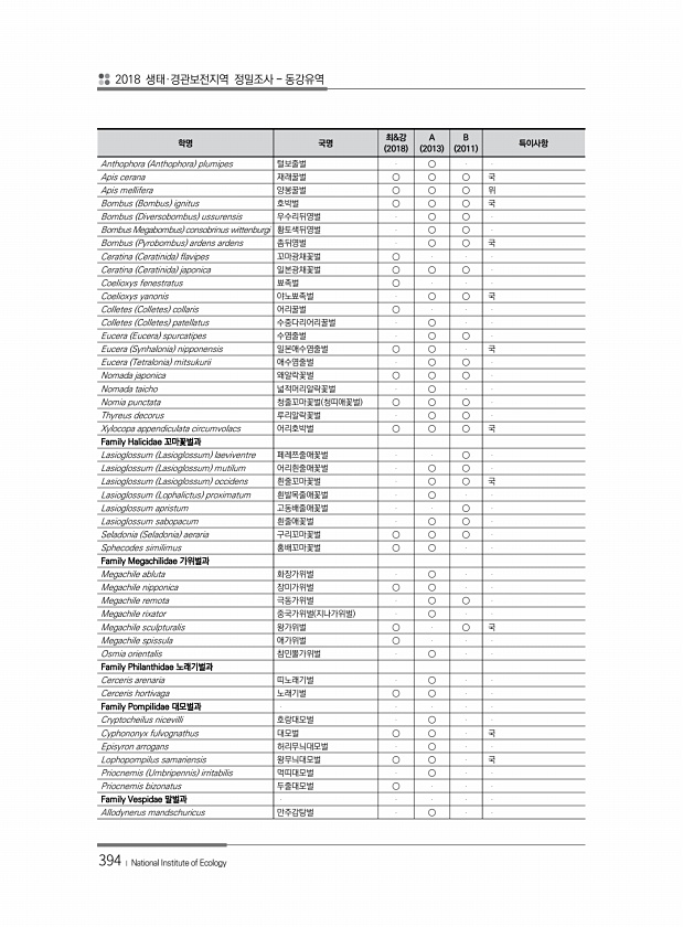 2018 생태·경관보전지역 정밀조사 동강유역 394 ? National Institute of Ecology 학명 국명 최&강 2018 A 2013 B 2011 특이사항 Anthophora Anthophora plumipes 털보줄벌 ○ Apis cerana 재래꿀벌 ○ ○ ○ 국 Apis mellifera 양봉꿀벌 ○ ○ ○ 위 Bombus Bombus ignitus 호박벌 ○ ○ ○ 국 Bombus Diversobombus ussurensis 우수리뒤영벌 ○ ○ Bombus Megabombus consobrinus wittenburgi 황토색뒤영벌 ○ ○ Bombus Pyrobombus ardens ardens 좀뒤영벌 ○ ○ 국 Ceratina Ceratinida flavi...