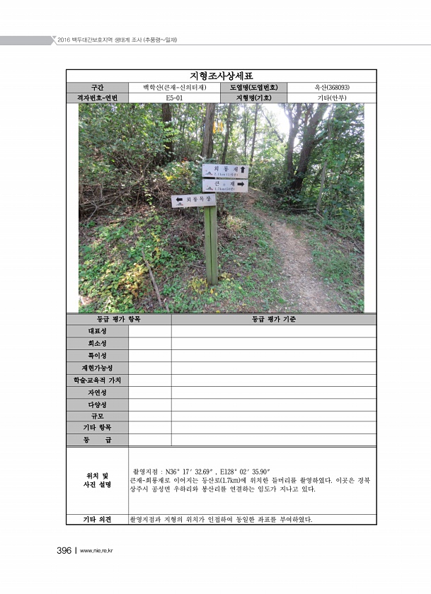 2016 백두대간보호지역 생태계 조사 추풍령밀재 396Ⅰwww.nie.re.kr 지형조사상세표 구간 백학산 큰재-신의터재 도엽명 도엽번호 옥산 368093 격자번호-연번 E5-01 지형명 기호 기타 안부 등급 평가 항목 등급 평가 기준 대표성 희소성 특이성 재현가능성 학술?교육적 가치 자연성 다양성 규모 기타 항목 등 급 위치 및 사진 설명 촬영지점 N36° 17′ 32.69″ , E128° 02′ 35.90″ 큰재-회룡재로 이어지는 등산로 1.7km 에 위치한 들머리를 촬영하였다. 이곳은 경북 상주시 공성면 우하리와 봉산리를 연결하는 임도가 지나고 있다. 기타 의견 촬영지점과 지형의 위치가 인접하여 동일한 좌표를부여하였다.
