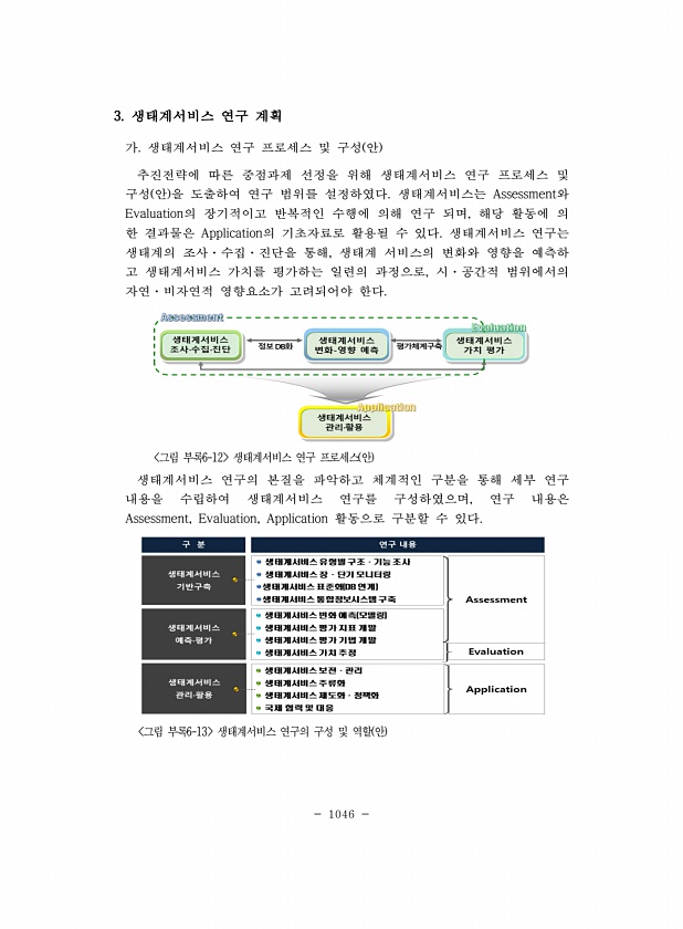 1046 3. 생태계서비스 연구 계획 가. 생태계서비스 연구 프로세스 및 구성 안 추진전략에 따른 중점과제 선정을 위해 생태계서비스 연구 프로세스 및 구성 안 을 도출하여 연구 범위를 설정하였다. 생태계서비스는 Assessment와 Evaluation의 장기적이고 반복적인 수행에 의해 연구 되며, 해당 활동에 의 한 결과물은 Application의 기초자료로 활용될 수 있다. 생태계서비스 연구는 생태계의 조사·수집·진단을 통해, 생태계 서비스의 변화와 영향을 예측하 고 생태계서비스 가치를 평가하는 일련의 과정으로, 시·공간적 범위에서의 자연·비자연적 영향요소가 고려되어야 한다. 그림 부록6-12 생태계서비스 연구 프로세스 안 생태계서비스 연구의 본질을 파악하고 체계적인 구분을 통해 세부 연구 내용을 수립하여...