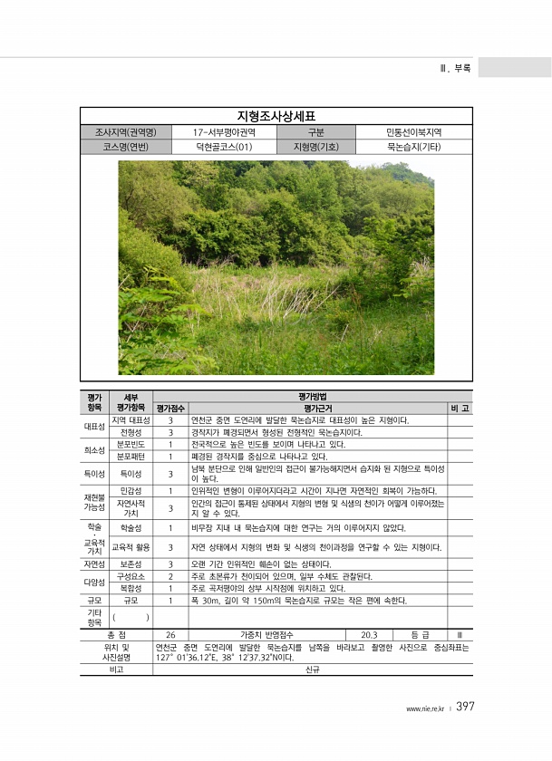 Ⅲ. 부록 www.nie.re.kr ? 397 지형조사상세표 조사지역 권역명 17-서부평야권역 구분 민통선이북지역 코스명 연번 덕현골코스 01 지형명 기호 묵논습지 기타 평가 항목 세부 평가항목 평가방법 평가점수 평가근거 비 고 대표성 지역 대표성 3 연천군 중면 도연리에 발달한 묵논습지로 대표성이 높은 지형이다. 전형성 3 경작지가 폐경되면서 형성된 전형적인 묵논습지이다. 희소성 분포빈도 1 전국적으로 높은 빈도를 보이며 나타나고 있다. 분포패턴 1 폐경된 경작지를 중심으로 나타나고 있다. 특이성 특이성 3 남북 분단으로 인해 일반인의 접근이 불가능해지면서 습지화 된 지형으로 특이성 이 높다. 재현불 가능성 민감성 1 인위적인 변형이 이루어지더라고 시간이 지나면 자연적인 회복이 가능하다. 자연사적 가치 3...