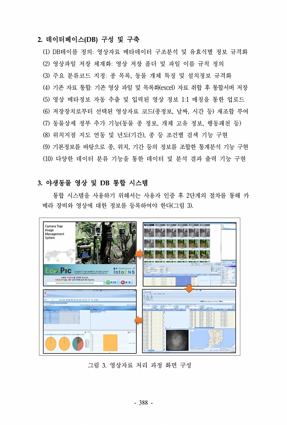 그림 3. 영상자료 처리 과정 화면 구성 2. 데이터베이스 DB 구성 및 구축 1 DB테이블 정의영상자료 메타데이터 구조분석 및 유효식별 정보 규격화 2 영상파일 저장 체계화영상 저장 폴더 및 파일 이름 규칙 정의 3 주요 분류코드 지정종 목록, 동물 개체 특징 및 설치정보 규격화 4 기존 자료 통합기존 영상 파일 및 목록화 excel 자료 취합 후 통합서버 저장 5 영상 메타정보 자동 추출 및 입력된 영상 정보 11 매칭을 통한 업로드 6 저장장치로부터 선택된 영상자료 코드 종정보, 날짜, 시간 등 재조합 부여 7 동물상세 정부 추가 기능 동물 종 정보, 개체 고유 정보, 행동패천 등 8 위치지점 지도 연동 및 년도 기간 , 종 등 조건별 검색 기능 구현 9 기본정보를 바탕으로 종, 위치, 기간 등의 정보...
