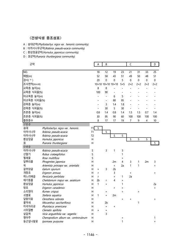 1146 건생식생 종조성표 A 솜대군락 Phyllostachys nigra var. henonis community B 아까시나무군락 Robinia pseudo-acacia community C 환삼덩굴군락 Humulus japonicus community D 칡군락 Pueraria thunbergiana community 군락 A B C D NO. 18 12 19 23 21 31 33 25 해발 m 52 58 43 51 49 50 48 51 경사 º 20 0 0 5 0 0 0 0 조사면적 m×m 10×10 10×10 10×10 5×5 2×2 2×2 2×2 2×2 교목층 높이 m 8 8 교목층 식피율 % 100 90 아교목층 높이 m 6 5 아교목층 식피율 % 80 95 관목층 높이 m 3 1.4 1.8 관...