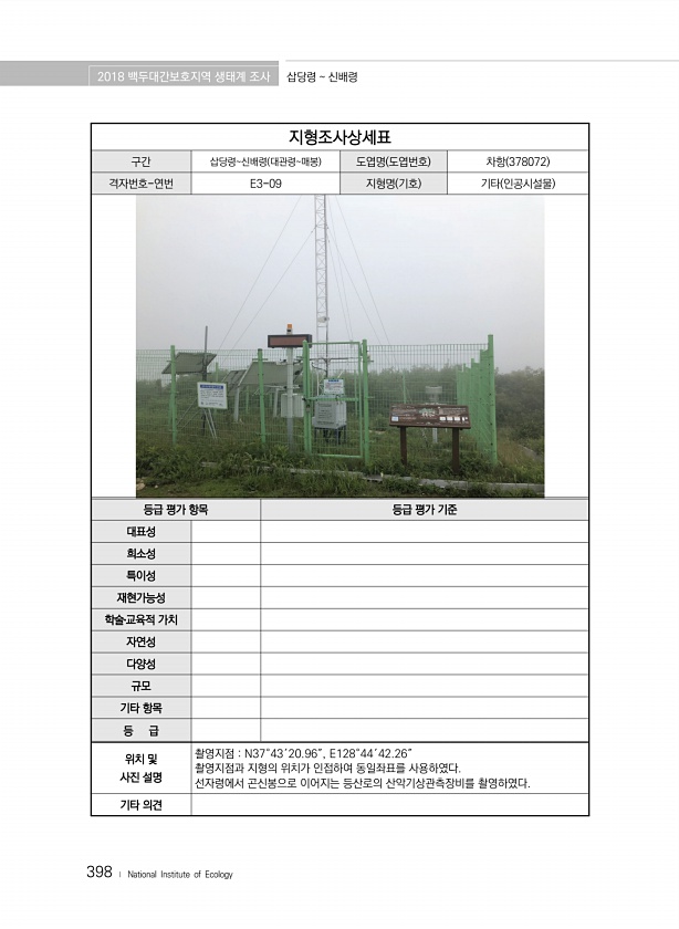 2018 백두대간보호지역 생태계 조사 삽당령 신배령 398 ? National Institute of Ecology 지형조사상세표 구간 삽당령신배령 대관령매봉 도엽명 도엽번호 차항 378072 격자번호-연번 E3-09 지형명 기호 기타 인공시설물 등급 평가 항목 등급 평가 기준 대표성 희소성 특이성 재현가능성 학술?교육적 가치 자연성 다양성 규모 기타 항목 등 급 위치 및 사진 설명 촬영지점 N37°43′20.96″, E128°44′42.26″ 촬영지점과 지형의 위치가 인접하여 동일좌표를 사용하였다. 선자령에서 곤신봉으로 이어지는 등산로의 산악기상관측장비를 촬영하였다. 기타의견