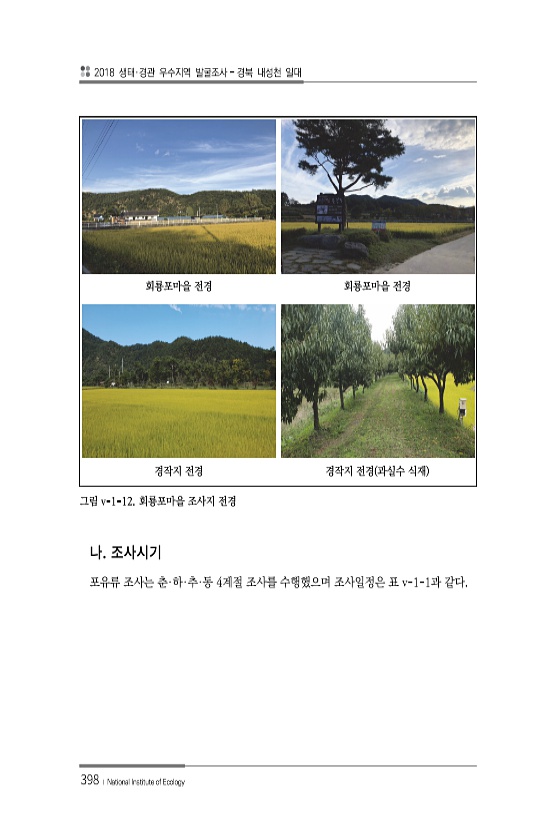 2018 생태·경관 우수지역 발굴조사 경북 내성천 일대 398 ? National Institute of Ecology 회룡포마을 전경 회룡포마을 전경 경작지 전경 경작지 전경 과실수 식재 그림 v-1-12. 회룡포마을 조사지 전경 포유류 조사는 춘·하·추·동 4계절 조사를 수행했으며 조사일정은 표 v-1-1과같다.