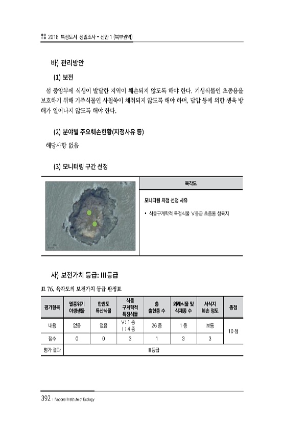 2018 특정도서 정밀조사 신안 1 북부권역 392 ? National Institute of Ecology 1 섬 중앙부에 식생이 발달한 지역이 훼손되지 않도록 해야 한다. 기생식물인 초종용을 보호하기 위해 기주식물인 사철쑥이 채취되지 않도록 해야 하며, 답압 등에 의한 생육 방 해가 일어나지 않도록 해야 한다. 2 해당사항 없음 3 육각도 모니터링 지점 선정 사유 ? 식물구계학적 특정식물 Ⅴ등급 초종용 생육지 평가항목 멸종위기 야생생물 한반도 특산식물 식물 구계학적 특정식물 총 출현종 수 외래식물 및 식재종 수 서식지 훼손 정도 총점 내용 없음 없음 Ⅴ1 종 Ⅰ4 종 26 종 1 종 보통 10 점 점수 0 0 3 1 3 3 평가 결과 Ⅲ등급 표 76. 육각도의 보전가치 등급판정표