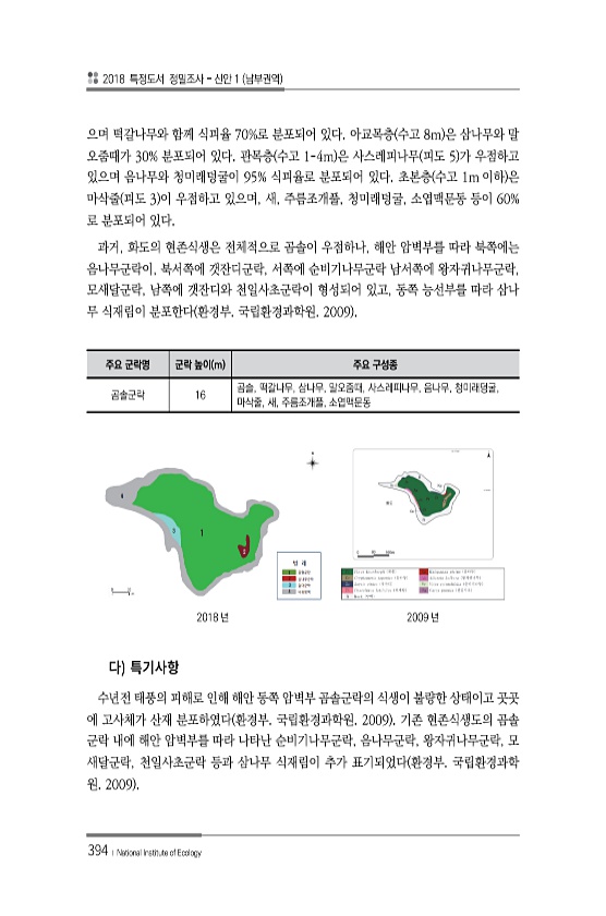 2018 특정도서 정밀조사 신안 1 남부권역 394 ? National Institute of Ecology 으며 떡갈나무와 함께 식피율 70%로 분포되어 있다. 아교목층 수고 8m 은 삼나무와 말 오줌때가 30% 분포되어 있다. 관목층 수고 1-4m 은 사스레피나무 피도 5 가 우점하고 있으며 음나무와 청미래덩굴이 95% 식피율로 분포되어 있다. 초본층 수고 1m 이하 은 마삭줄 피도 3 이 우점하고 있으며, 새, 주름조개풀, 청미래덩굴, 소엽맥문동 등이 60% 로 분포되어 있다. 과거, 화도의 현존식생은 전체적으로 곰솔이 우점하나, 해안 암벽부를 따라 북쪽에는 음나무군락이, 북서쪽에 갯잔디군락, 서쪽에 순비기나무군락 남서쪽에 왕자귀나무군락, 모새달군락, 남쪽에 갯잔디와 천일사초군락이 형성되어 있고, 동쪽...