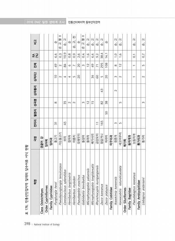 학명 국명 천미리 월명리 성곡령 상무룡리 심적리2 전체 RA % 비고 Class Osteichthyes 경골어 강 Order Cypriniformes 잉어목 Family Cyprinidae 잉어과 Pungtungia herzi 돌고기 31 8 10 49 6.4 순 Pseudopungtungia tenuicorpus 가는돌고기 2 2 0.3 순 고 멸 II Coreoleuciscus splendidus 쉬리 45 35 4 84 10.9 순, 고 Hemibarbus longirostris 참마자 2 4 6 0.8 순 Hemibarbus mylodon 어름치 2 5 7 0.9 순, 고, 천 Pseudogobio esocinus 모래무지 20 20 2.6 순 Gobiobotia brevibarba 돌상어 3 3 0...