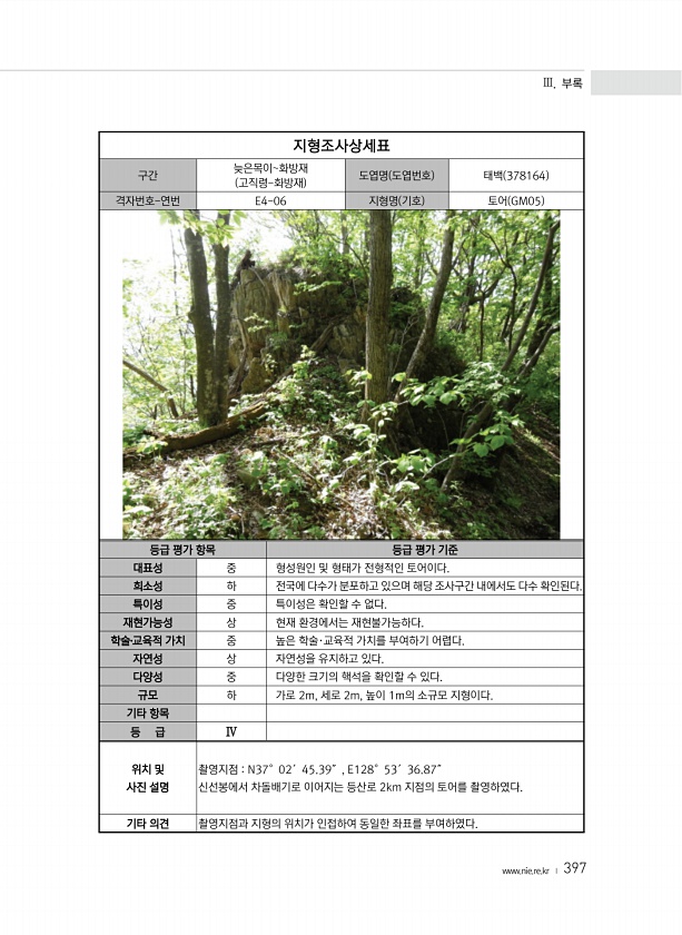 Ⅲ. 부록 www.nie.re.kr ? 397 지형조사상세표 구간 늦은목이화방재 고직령-화방재 도엽명 도엽번호 태백 378164 격자번호-연번 E4-06 지형명 기호 토어 GM05 등급 평가 항목 등급 평가 기준 대표성 중 형성원인 및 형태가 전형적인 토어이다. 희소성 하 전국에 다수가 분포하고 있으며 해당 조사구간 내에서도 다수 확인된다. 특이성 중 특이성은 확인할 수 없다. 재현가능성 상 현재 환경에서는 재현불가능하다. 학술?교육적 가치 중 높은 학술·교육적 가치를 부여하기 어렵다. 자연성 상 자연성을 유지하고 있다. 다양성 중 다양한 크기의 핵석을 확인할 수 있다. 규모 하 가로 2m, 세로 2m, 높이 1m의 소규모 지형이다. 기타 항목 등 급 Ⅳ 위치 및 사진 설명 촬영지점 N37°02′45.39″...