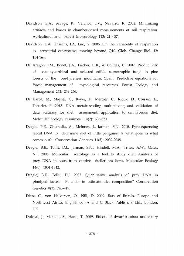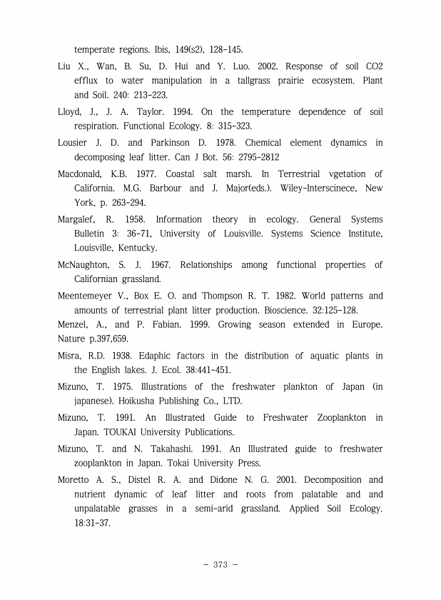 373 temperate regions. Ibis, 149 s2 , 128-145. Liu X., Wan, B. Su, D. Hui and Y. Luo. 2002. Response of soil CO2 efflux to water manipulation in a tallgrass prairie ecosystem. Plant and Soil. 240213-223. Lloyd, J., J. A. Taylor. 1994. On the temperature dependence of soil respiration. Functional Ecology. 8315-323. Lousier J. D. and Parkinson D. 1978. Chemical element dynamics in decomposing leaf l...