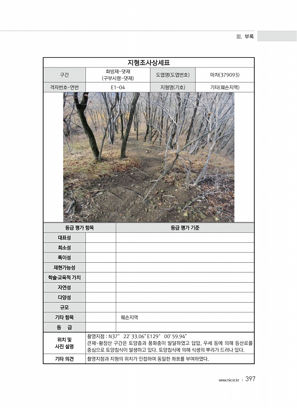 Ⅲ. 부록 www.nie.re.kr ? 397 지형조사상세표 구간 화방재댓재 구부시령댓재 도엽명 도엽번호 마차 379093 격자번호-연번 E1-04 지형명 기호 기타 훼손지역 등급 평가 항목 등급 평가 기준 대표성 희소성 특이성 재현가능성 학술?교육적 가치 자연성 다양성 규모 기타 항목 훼손지역 등 급 위치 및 사진 설명 촬영지점 N37° 2233.06E129° 0059.94큰재황장산 구간은 토양층과 풍화충이 발달하였고 답압, 우세 등에 의해 등산로를 중심으로 토양침식이 발생하고 있다. 토양침식에 의해 식생의 뿌리가 드러나 있다. 기타 의견 촬영지점과 지형의 위치가 인접하여 동일한 좌표를부여하였다.
