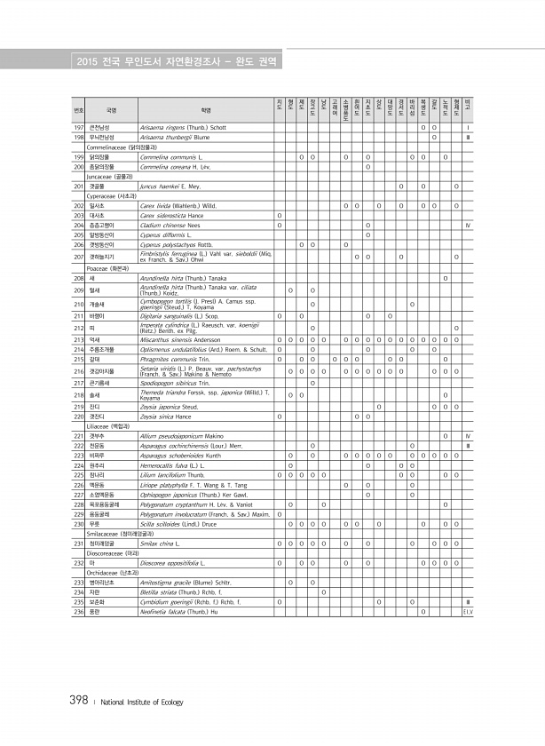 2015 전국 무인도서 자연환경조사 완도 권역 398 ? National Institute of Ecology 번호 국명 학명 치도 형도 제도 장고도 낭도 고래여 소병풍도 흰여도 지초도 상도 대망도 경서도 바리섬 복생도 갈도 노적도 형제도 비고 197 큰천남성 Arisaema ringens Thunb. Schott O O Ⅰ 198 무늬천남성 Arisaema thunbergii Blume O Ⅲ Commelinaceae 닭의장풀과 199 닭의장풀 Commelina communis L. O O O O O O O 200 좀닭의장풀 Commelina coreana H. L?v. O Juncaceae 골풀과 201 갯골풀 Juncus haenkei E. Mey. O O O Cyperaceae 사초과 202 밀사초 ...
