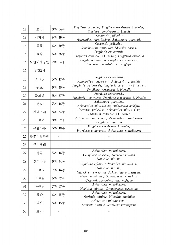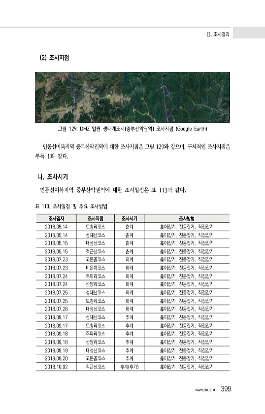 Ⅱ. 조사결과 www.nie.re.kr ? 399 2 조사지점 그림 129. DMZ 일원 생태계조사 중부산악권역 조사지점 Google Earth 민통선이북지역 중부산악권역에 대한 조사지점은 그림 129와 같으며, 구체적인 조사지점은 부록 1과 같다. 나. 조사시기 민통선이북지역 중부산악권역에 대한 조사일정은 표 113과 같다. 표 113. 조사일정 및 주요 조사방법 조사일자 조사지점 조사시기 조사방법 2018.05.14 도창리코스 춘계 훑어잡기, 진동잡기, 직접잡기 2018.05.14 성재산코스 춘계 훑어잡기, 진동잡기, 직접잡기 2018.05.15 대성산코스 춘계 훑어잡기, 진동잡기, 직접잡기 2018.05.15 적근산코스 춘계 훑어잡기, 진동잡기, 직접잡기 2018.07.23 고둔골코스 하계 훑어잡기, ...