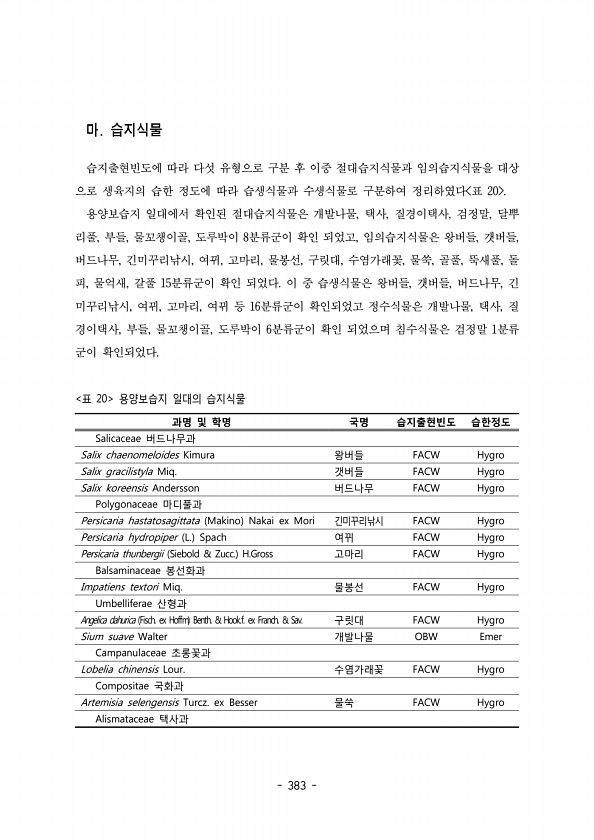 383 습지출현빈도에 따라 다섯 유형으로 구분 후 이중 절대습지식물과 임의습지식물을 대상 으로 생육지의 습한 정도에 따라 습생식물과 수생식물로 구분하여 정리하였다 표 20 용양보습지 일대에서 확인된 절대습지식물은 개발나물 택사 질경이택사 검정말 달뿌 , , , , 리풀 부들 물꼬챙이골 도루박이 분류군이 확인 되었고 임의습지식물은 왕버들 갯버들 , , , 8 , , , 버드나무 긴미꾸리낚시 여뀌 고마리 물봉선 구릿대 수염가래꽃 물쑥 골풀 뚝새풀 돌 , , , , , , , , , , 피 물억새 갈풀 분류군이 확인 되었다 이 중 습생식물은 왕버들 갯버들 버드나무 긴 , , 15 , , , 미꾸리낚시 여뀌 고마리 여뀌 등 분류군이 확인되었고 정수식물은 개발나물 택사 질 , , , 16 , , 경이택사 부들 물꼬챙...