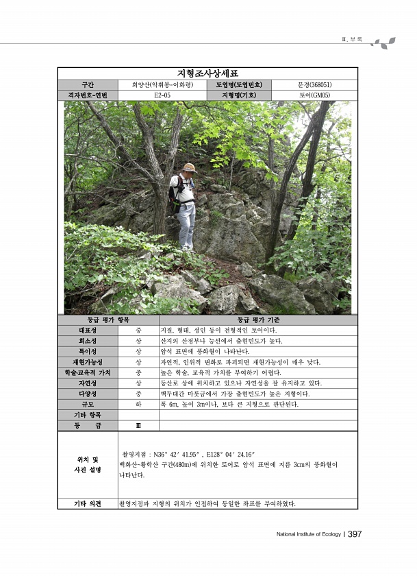 Ⅲ. 부 록 National Institute of EcologyⅠ397 지형조사상세표 구간 희양산 악휘봉-이화령 도엽명 도엽번호 문경 368051 격자번호-연번 E2-05 지형명 기호 토어 GM05 등급 평가 항목 등급 평가 기준 대표성 중 지질, 형태, 성인 등이 전형적인 토어이다. 희소성 상 산지의 산정부나 능선에서 출현빈도가 높다. 특이성 상 암석 표면에 풍화혈이 나타난다. 재현가능성 상 자연적, 인위적 변화로 파괴되면 재현가능성이 매우 낮다. 학술?교육적 가치 중 높은 학술, 교육적 가치를 부여하기 어렵다. 자연성 상 등산로 상에 위치하고 있으나 자연성을 잘 유지하고 있다. 다양성 중 백두대간 마룻금에서 가장 출현빈도가 높은 지형이다. 규모 하 폭 6m, 높이 3m이나, 보다 큰 지형으로 판단된다....
