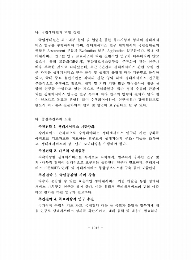 1047 나. 국립생태원의 역할 정립 국립생태원은 외·내부 협력 및 협업을 통한 목표지향적 형태의 생태계서 비스 연구를 수행하여야 하며, 생태계서비스 연구 체계에서의 국립생태원의 역할은 Assessment 부분과 Evaluation 일부, Application 일부분이다. 국내 생 태계서비스 연구는 연구 프로세스에 따른 전반적인 연구가 이루어지지 않고 있으며, 특히 표준화 DB연계 , 통합정보시스템구축, 주류화에 관한 연구가 매우 부족한 것으로 나타났는데, 최근 3년간의 생태계서비스 관련 수행 연 구 과제를 생태계서비스 연구 분야 및 생태계 유형에 따라 기관별로 분석하 였고, 국내 주요 유관기관은 각자의 관할 영역 하에 생태계서비스 연구를 부분적으로 수행하고 있으며, 대학 및 기타 기관 또한 관심분야에 대한...