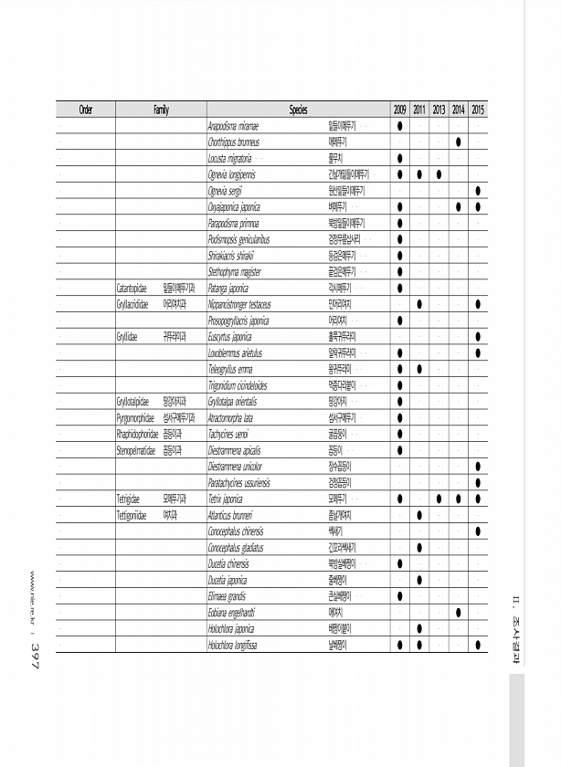 397 Order Family Species 2009 2011 2013 2014 2015 Anapodisma miramae 밑들이메뚜기 ● Chorthippus brunneus 애메뚜기 ● Locusta migratoria 풀무치 ● Ognevia longipennis 긴날개밑들이메뚜기 ● ● ● Ognevia sergii 원산밑들이메뚜기 ● Oxyajaponica japonica 벼메뚜기 ● ● ● Parapodisma primnoa 북방밑들이메뚜기 ● Podismopsis genicularibus 검정무릎삽사리 ● Shirakiacris shirakii 등검은메뚜기 ● ...